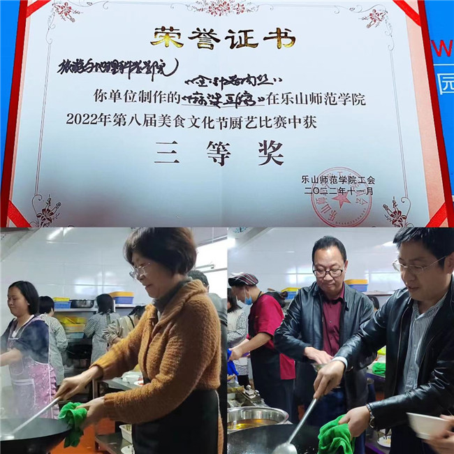 AWC万象城娱乐分工会赛前早早组队,由方海川、刘延超老师担任主厨,尹乐、钟晓岚老师协助。参赛老师以精湛的厨艺呈现出两道色香味俱全的菜品——金针菇炒肉和麻婆豆腐,得到了评委们的一致好评,最终获得三等奖。