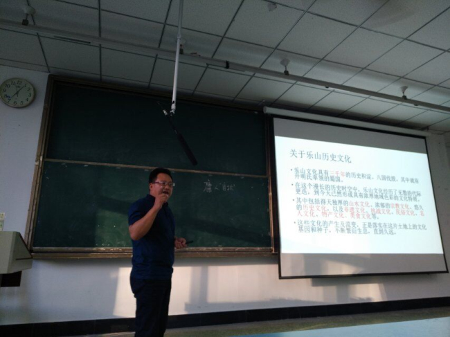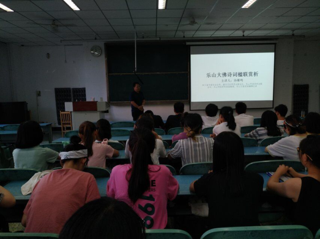 首先,孙雁鸣教授从乐山得天独厚的山水文化、宗教文化、美食文化等入手,介绍了乐山的历史文化特质。随后他重点介绍了乐山大佛修建的相关背景知识。然后孙教授重点为同学们剖析了《东坡楼联》、《碑林门联》、《山门联》等景区对联的内涵,以及历代文人墨客记述嘉州胜景的诗歌作品。最后,他鼓励当代大学生要大力弘扬诗词楹联文化,传承祖国的文化瑰宝。