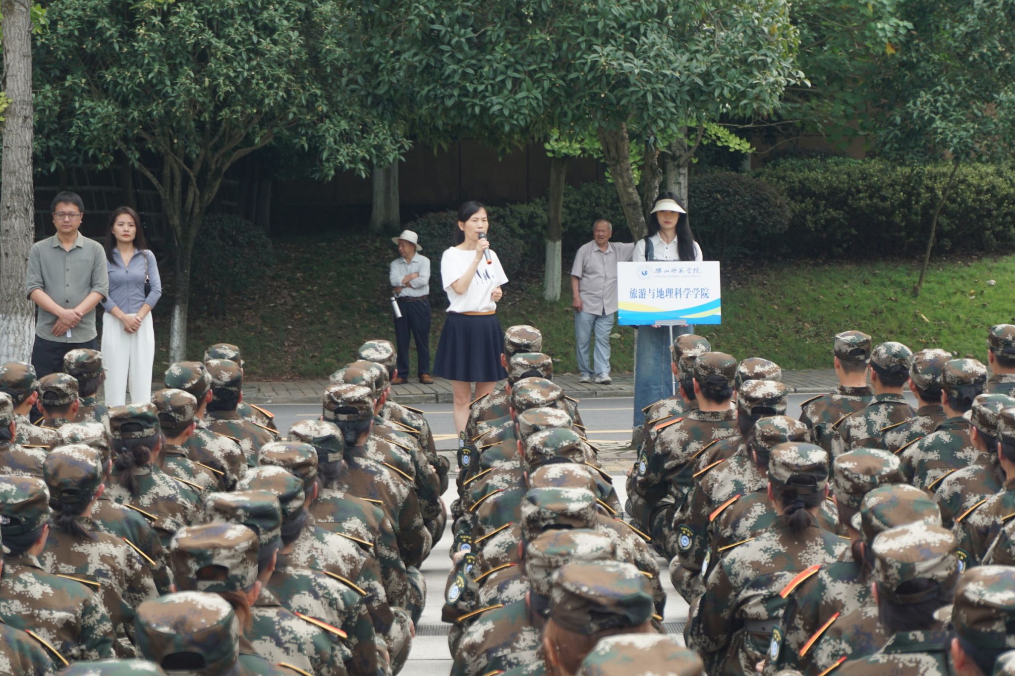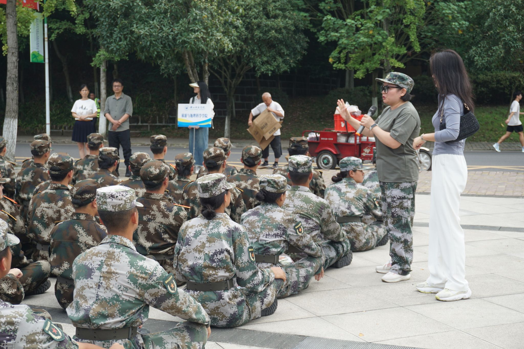 徐秀云对同学们在军训中表现出来的吃苦耐劳的精神予以了充分肯定。她指出,军训旨在提升同学们的国防意识、纪律意识、团结协作意识,有助于磨练同学们的意志品质,提升同学们的精神境界,勉励学员们要牢记“听党指挥、能打胜仗、作风优良”的强军目标,将在军训中养成的优良作风贯穿到整个大学生活中。江纳代表学院对承训教官致以诚挚感谢,并表扬了学员们不畏烈日、严循指令的精神品格。她叮嘱同学们在训练中继续顽强拼搏,奋勇争先,以昂扬向上的精神风貌圆满完成此次军训任务。随后,学院领导、老师和学生干部代表向教官和全体学员发放了慰问品。