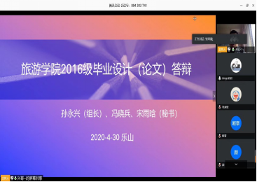 本网讯(文、图/冯晓兵)毕业论文 (设计)是本科教学过程的重要环节,是本科教育教学中的最后一个环节,也是本科毕业生申请学士学位的必需环节。4月30日下午2点,旅游学院组织开展2020届第二批毕业论文网路答辩会。本次答辩共分为5个答辩组,分别由王瑛教授、陈金龙副教授、秦容副教授、方海川副教授、孙永兴副教授担任答辩组长,参加答辩的学生涉及2016级旅游管理、酒店管理专业,共150多名学生参加。由于处于疫情防控期间,学生没有返校,本次毕业论文答辩采取腾讯会议平台的网络答辩形式,由学生陈述论文、评阅教师点评论文、提问答辩等环节构成。从答辩结果来看,绝大部分学生的毕业论文达到了AWC万象城娱乐本科毕业论文(设计)的要求,顺利通过了答辩;个别学生由于内容不符合专业要求、内容专业性不够、格式不符合规范等原因,未能通过答辩。