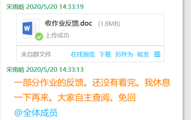 因为没有办法像普通上课一样集中授课,所以对于作业的反馈很重要,而且制图作业不是画完就完事了,很多细节需要一一反馈。为了使每个同学都能及时发现错误,改正错误,每次检查完作业,宋老师都会写回访WPRD挂在群中。
