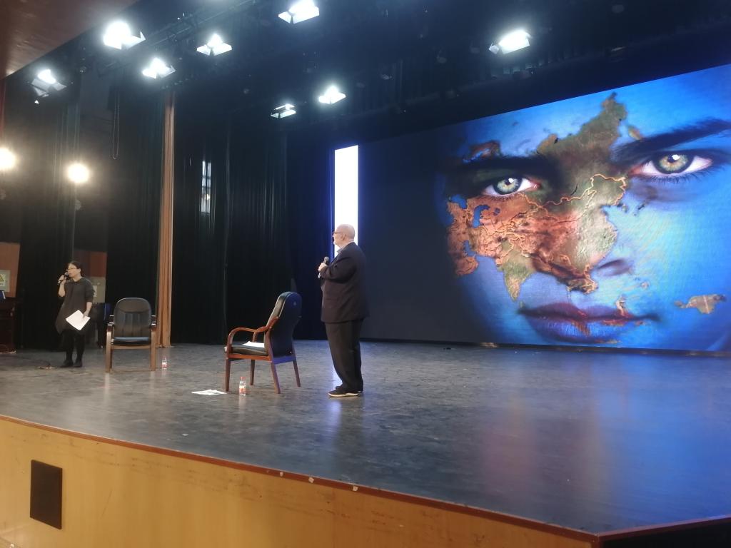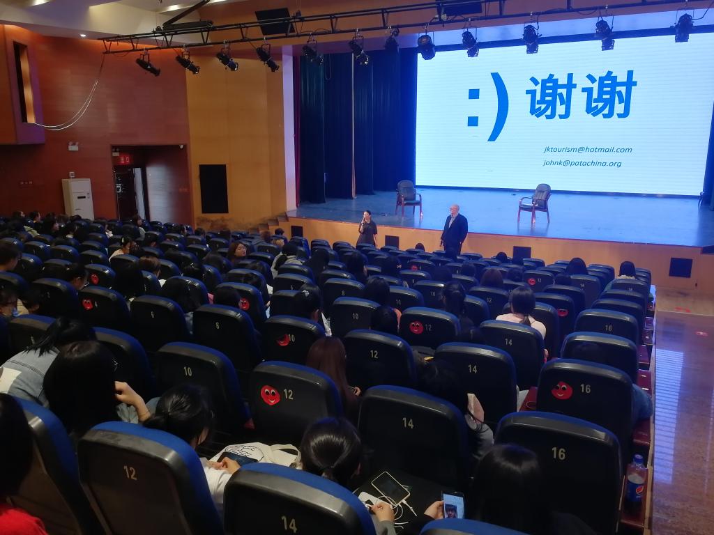 (文图/陈金龙)11月12日下午,由旅游学院主办的2020级新生“专业导论与职业生涯规划”课程专家讲座在学校多功能厅顺利召开。旅游管理专业负责人陈金龙副教授主持讲座,AWC万象城娱乐旅游学院外籍专家、亚太旅游协会首席执行官特别顾问张科德(John Koldowski)主讲,乐山伊桥幼儿园(筹)外语教师司冬玲担任翻译。旅游学院王瑛教授、2020级全体新生、部分2019级学生参加了讲座。