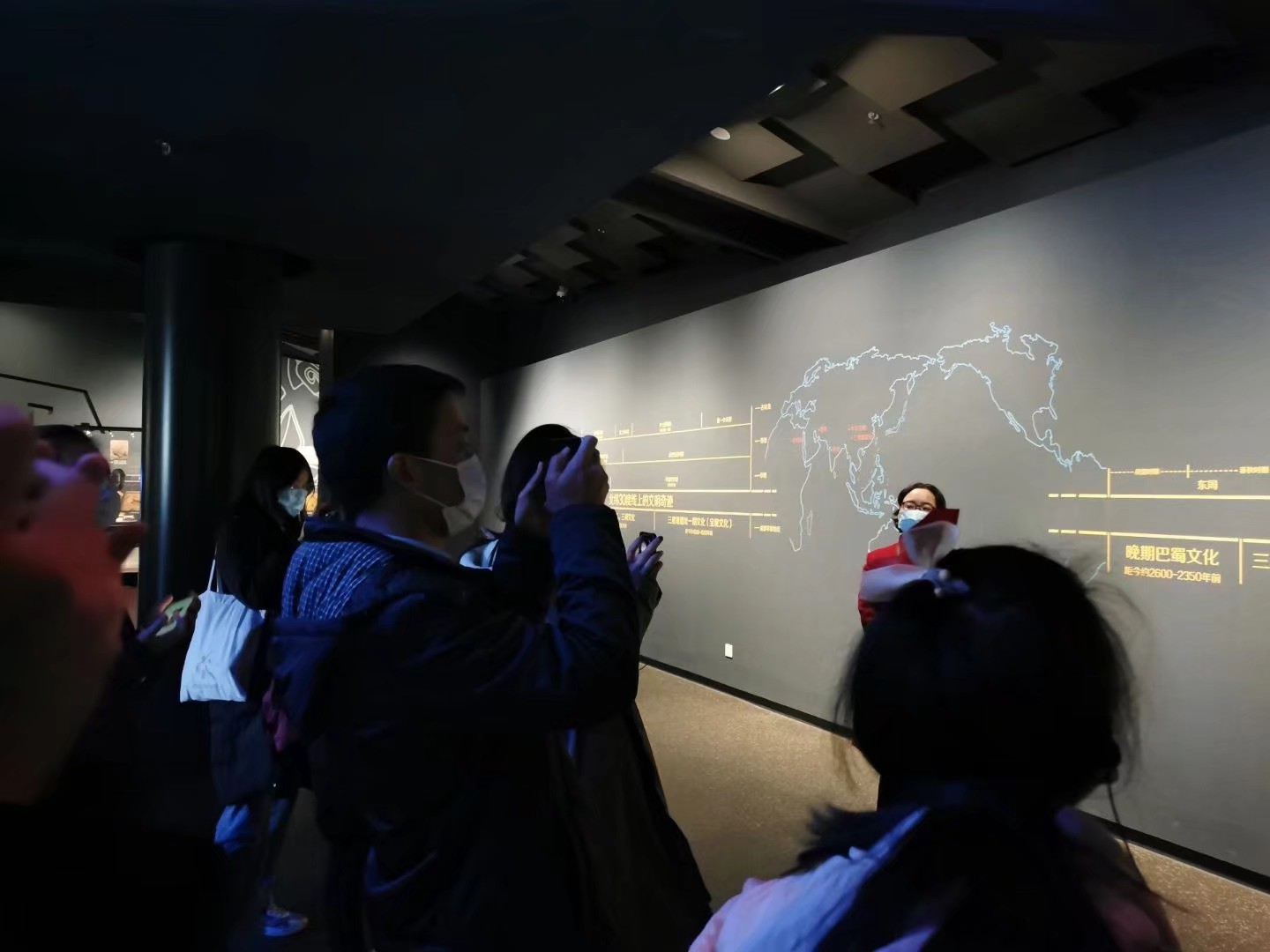 进入馆内,首先映入眼帘的是一个巨大的菱形播放器,它是以青铜菱形眼形器为灵感铸就而成的。此时正层见叠出地播放着三星堆的由来及其历史演化过程,就着讲解员清脆的声音,同学们仿佛正置身于青铜器时代,清晰地感受着古代文化的壮丽。