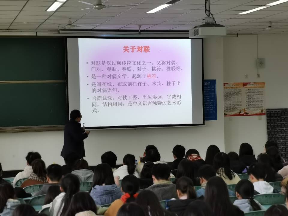 2020年12月10日,下午2点10分在行知楼301教室,讲座如约开始。孙教授首先为同学们讲解了楹联的定义,然后深入浅出地区分了楹联和传统对联的区别及和诗词的联系。然后同学们积极参与讲座互动,体现了传统文化的魅力,依然蓬勃着生机,吸引着一代又一代的人。尤其是同学们亲自赏读多字联:“海水朝朝朝朝朝朝朝落,浮云长长长长长长长消”,真正的感受到了楹联文化的魅力。文化的薪火,将代代相承。