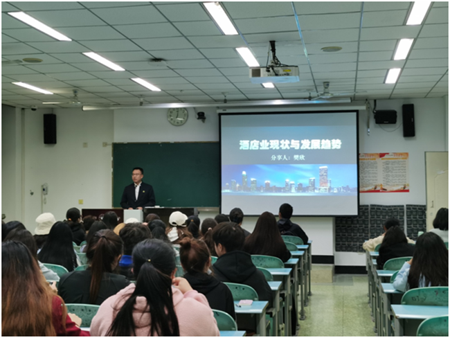 本次讲座主题是《酒店业的现状与发展趋势》。樊欣用生动有趣的照片与视频、大量数据给同学们做了一场精彩的演讲,讲述网络时代给酒店业带来的挑战与机遇,对酒店业当前面临的困难及未来发展趋势作了深刻的剖析和展望,介绍了禅驿酒店品牌的“网红”之路,热情邀请同学们有空去打卡。樊欣鼓励同学们珍惜在校时光,夯实专业基础,找准自身定位,进行职业规划,能够跨界,会玩会创新,为成功在旅游与酒店行业就业打下基础。