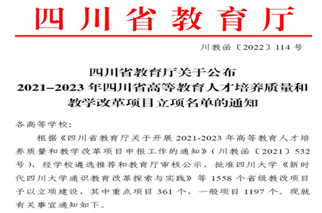 本网讯(文、图/但强)近日,四川省教育厅公布了《2021-2023年四川省高等教育人才培养质量和教学改革项目立项名单》,万象城教师王瑛、但强、孙永兴成功立项(名单详见附件)。