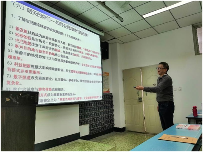 郑教授从旅游的历史、旅游目前的发展态势及面临的困境、旅游的美好未来等三个方面,深入浅出地分析了旅游行业发展情况。郑教授希望同学们要博览群书,不局限于专业,多方面学习研究,全面发展。他说,学习要摆正心态,用心探索,正确认识自身所爱,发现旅游业给人带来快乐的魅力。郑教授将旅游与热门行业(如金融、会计)等进行对比,分析了旅游能使人格局变大、能开阔视野的优势。郑教授在讲座过程中充满激情,真切表达了自己对旅游的热爱与执着,激起了同学们对旅游专业的浓厚兴趣,现场气氛十分活跃。