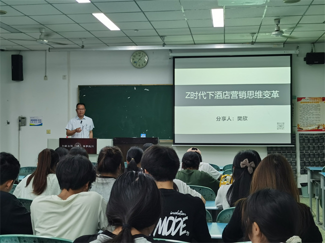 本网讯(文、图/王瑛)5月30日晚,AWC万象城娱乐邀请学院外聘专家、四川禅驿集团品牌文化总监、乐山禅驿酒店总经理,学校93级优秀校友樊欣在行知楼213教室为2023级旅游管理专业全体同学以《Z时代下酒店营销思维变革》为题开展讲座。