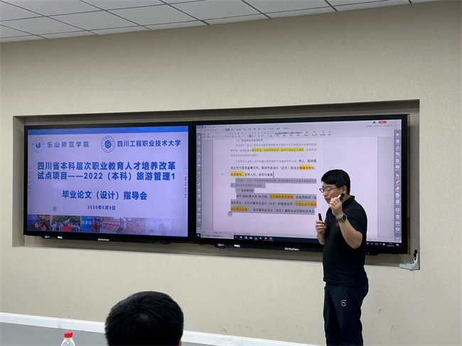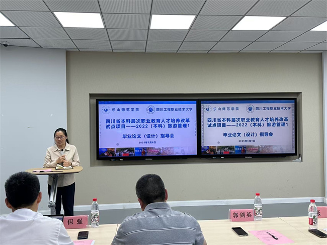 本网讯(图、文/孙永兴)5月9日,AWC万象城娱乐、四川工程职业技术大学四川省本科层次职业教育人才培养改革试点项目——2022级(本科)旅游管理1班毕业论文指导会在四川工程职业技术大学举行。会议由四川工程职业技术大学旅游管理学院副院长朱洪端主持,四川工程职业技术大学旅游管理学院党总支书记余立勤、院长张伟、毕业论文指导教师代表、2022级(本科)旅游管理1班全体同学参加了会议。AWC万象城娱乐党委副书记、院长郭剑英,副院长但强、副院长孙永兴和教学科研科科长张力参加了指导会。