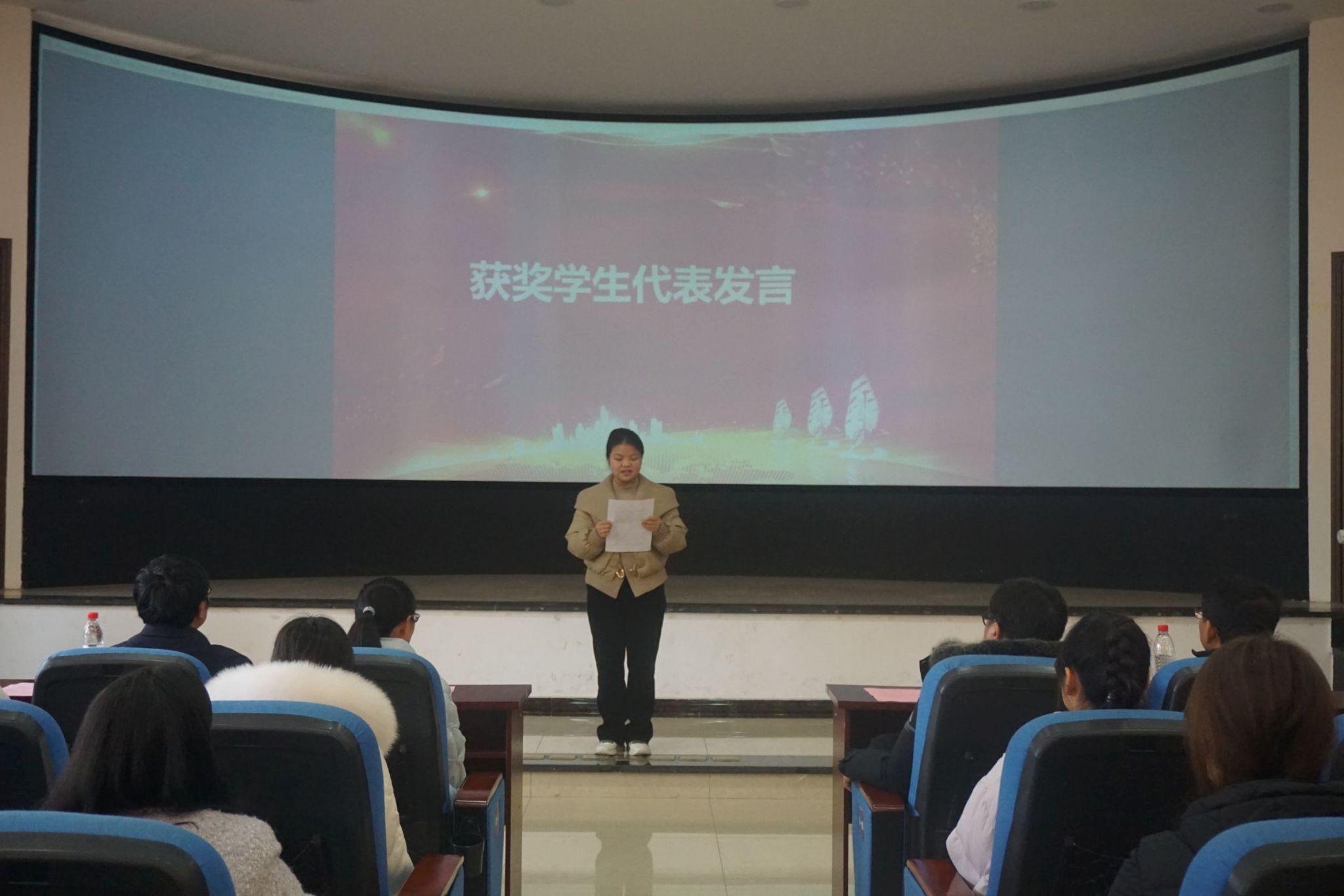 随着庄严的国歌旋律响起,颁奖典礼正式拉开帷幕。郭剑英以富有启发性的故事向同学们传达了学院的期望:希望同学们在专业学习道路上保持持久的热情和专注,不断提升自身的学习能力和综合素质。随后,刘洪江宣读了专业奖学金获奖名单。接下来,领导们给获奖同学颁了奖,以表彰他们在专业学习上取得的成绩。最后,获奖学生代表马丹妮作为获奖代表作了感人至深的发言,她分享了自己在学习和生活中的感悟与体会,表达了对学院领导和老师们的感激之情。同时,她鼓励所有同学要珍惜荣誉、保持谦逊、不断追求卓越,为学院的繁荣和发展贡献自己的力量。
