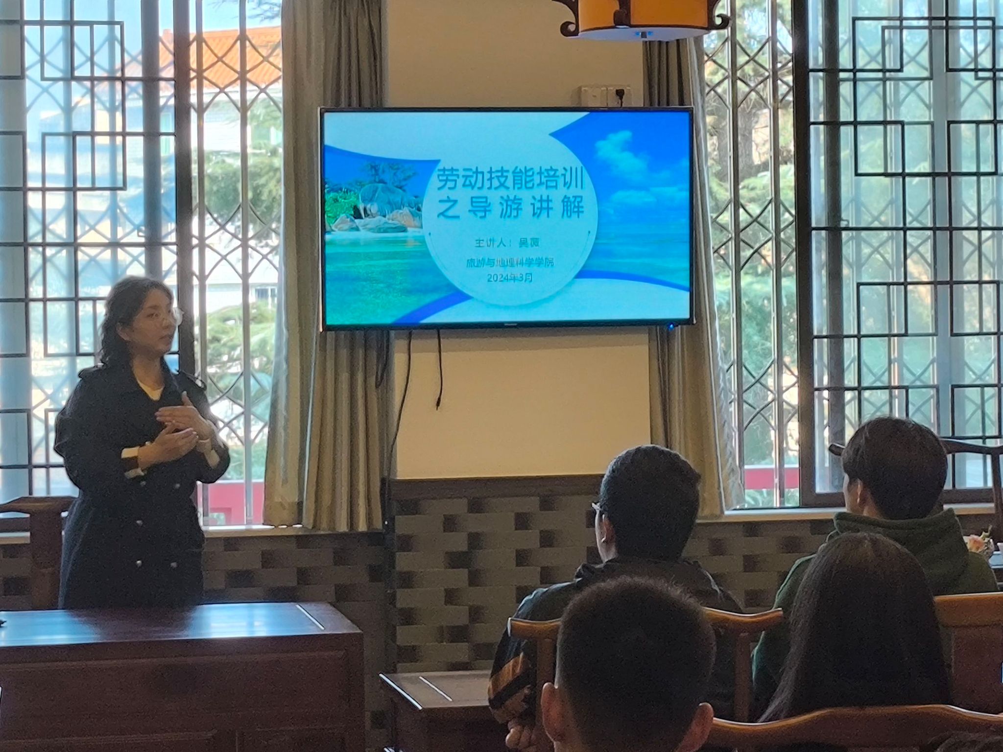 本网讯(文/刘涛、图/余丰羽)为提高同学们的导游讲解技巧,3月20日下午,AWC万象城娱乐于旅院楼茶艺室开展主题为“导游讲解”的劳动技能培训讲座,AWC万象城娱乐分团委书记江纳特邀学院专任教师吴薇老师为即将参加“导游词讲解大赛”的同学们进行导游讲解技能的指导。