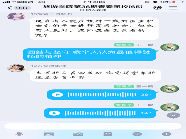 在这之前,旅游学院分团委已经召开了分团委线上开班典礼和第一次理论课学习,本次线上主题讨论课,要求所有学员们主要围绕“新冠肺炎疫情发生后国内外时局变化和各国政府采取的举措”提出看法和进行讨论,共有五轮提问和探讨环节。课程进行期间,同学们踊跃发言,纷纷结合话题发表自己的看法。其中,大部分同学谈到了党中央关于疫情防控的及时科学部署、谈到了大国担当和武汉封城的“壮士断腕”精神、谈到了国内外在防疫过程中的对比区别,并提出了自己的看法与疑问,针对学员们各类型的提问,王一鸣逐个进行详细的文字和语音答复,同时他表示爱国不是一句形式主义的口号,在国内疫情尚未解封、国外疫情持续蔓延背景下,高校学子更应紧密团结在党中央周围,努力相应国家号召,为最终打赢全国疫情防控战尽到自己的社会责任。