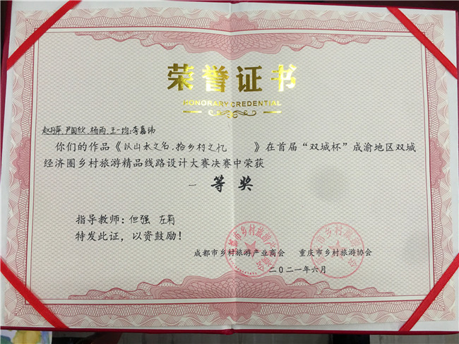 本网讯(文/左莉、图/赵丹萍)为了践行国家乡村振兴战略和中共中央政治局审议通过的《成渝地区双城经济圈建设规划纲要》精神,6月5日,由成渝地区双城经济圈乡村振兴学院联盟、成都市乡村旅游产业商会和重庆市乡村旅游协会主办,重庆文理学院、四川师范大学以及成都文理学院共同承办的首届“双城杯”乡村旅游精品线路设计大赛总决赛在重庆文理学院举行。比赛一共有来自重庆、四川、江苏、云南、陕西等省市100多件作品参赛,共有23支队伍入围了大赛决赛。万象城旅游学院推送的《以山水之名,拾乡村之忆》项目入围决赛,并荣获一等奖,学校获得了“优秀组织奖”的殊荣。
