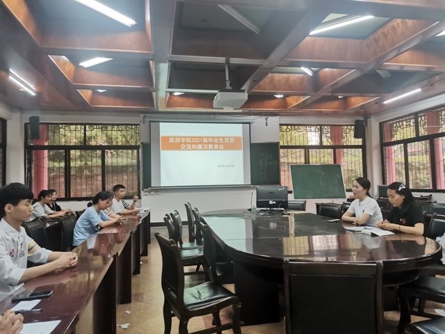本网讯(文/刘国良、图/巫瑞)6月21日下午,旅游学院2021届毕业生党员交流和廉洁教育会在旅游学院实训楼102举行,学院党总支组织委员学生科长左莉、2017级辅导员谭妙以及2021届全体毕业生党员参加本次会议。