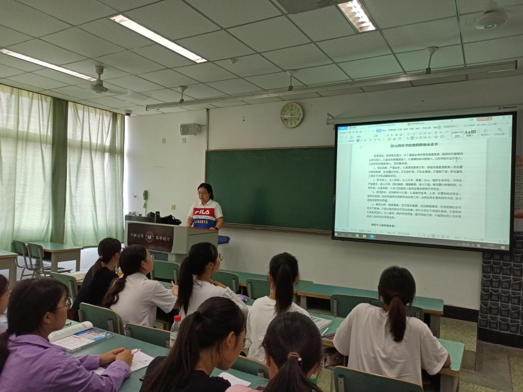 本网讯(文、图/杨江双)金秋送爽,丹桂飘香,暑去秋来,新的学期随之来临。为了践行“弘毅自强,笃学践行”的校训,培养同学们尊师重道的良好品质,规范学校的教学秩序,2021年8月31日,旅游学院所有教学班在新学期的第一堂课上开展了“学德承诺”活动。