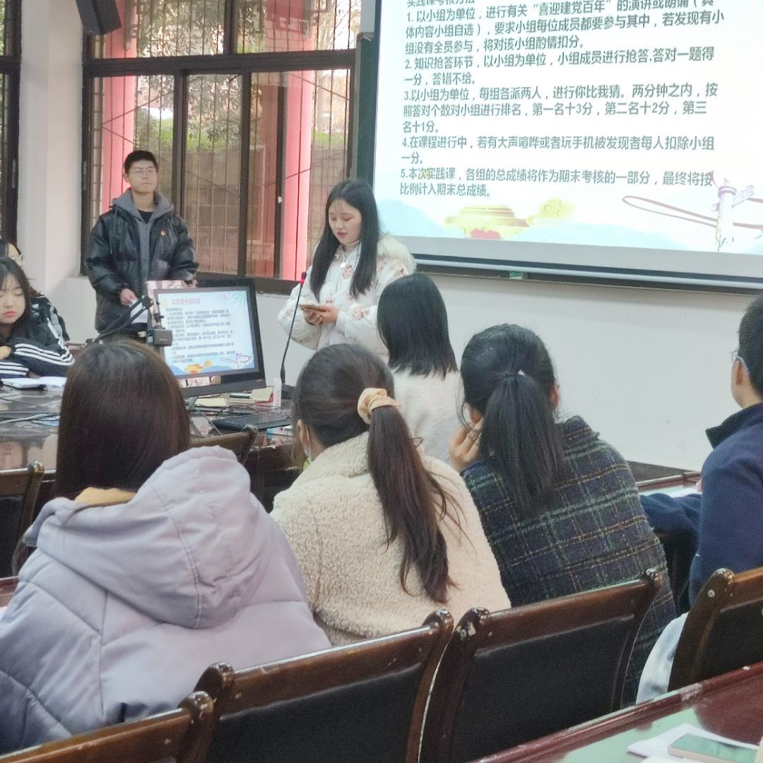 本次实践课在“我们是五月的花海”的嘹亮歌声中拉开帷幕。分团委组织部副部长莫凤宣读了实践课考核标准。团校各小组学员上台围绕“喜迎建党百年”进行演讲或朗诵,大家纷纷把对建党百年的祝福之情融入演讲和朗诵中,带着对祖国满满的骄傲和自豪之情。实践课上,还考察了同学们对共青团的了解,强化了同学们在团课中所学的知识。在“心有灵犀”挑战中,学员们不仅愉悦了身心,相互之间的默契也得到了培养。