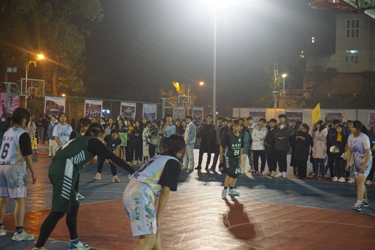 本场比赛由旅游学院对人工智能学院。上半场比赛,我方球员比分落后,但我方男球员全力以赴,整个球场充满了紧张的气氛;下半场我方女球员迎难而上,奋起直追,将比分拉近。比赛紧张而激烈地进行着,场下的老师和同学们为球员们加油喝彩。第四场比赛进入白热化状态,双方拼抢很激烈,我方男球员们配合默契,最后反超比分,以46:36赢下了本场比赛,成功晋级四强。球员们和啦啦队员以及21级部分同学合影留念。