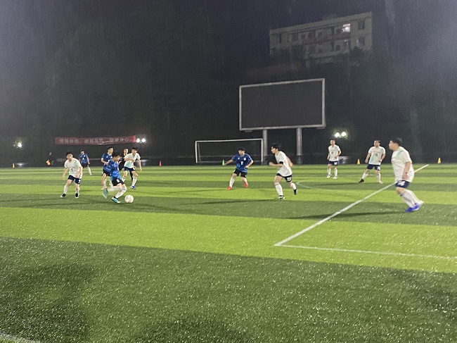 随着裁判的一声哨响,比赛如火如荼地开始进行。两支球队的队员开始了他们激烈的拼抢,双方队员都毫不示弱,各自展现出细腻的脚法、默契的配合,现场竞争激烈。虽然天公不作美,下起了雨且下得愈来愈大,但丝毫不影响球员们的激情。最终,旅游学院和马克思主义学院以2:0的成绩赢得了本场比赛。