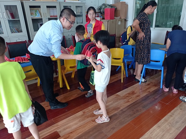 在这八天时间里,由于天气炎热,喻老师奔波于该团队服务的各站点,为志愿者送去防暑药物,同时为服务站小朋友带去了解暑的水果。