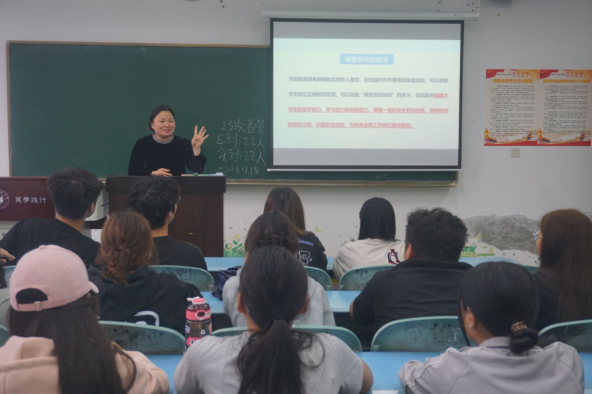 本网讯(文/江纳、王东梅 图/卿婷)近日,AWC万象城娱乐(以下简称“旅地学院”)为进一步加强劳动教育、积极落实“五育并举”的工作措施,在行知楼123教室举办了“青少年劳动教育项目开发与实施”活动启动仪式。学校后勤服务保障部综合科负责人王斌,旅地学院分团委书记、学生工作办公室主任江纳和2023级酒店管理班全体学生参加了启动仪式。