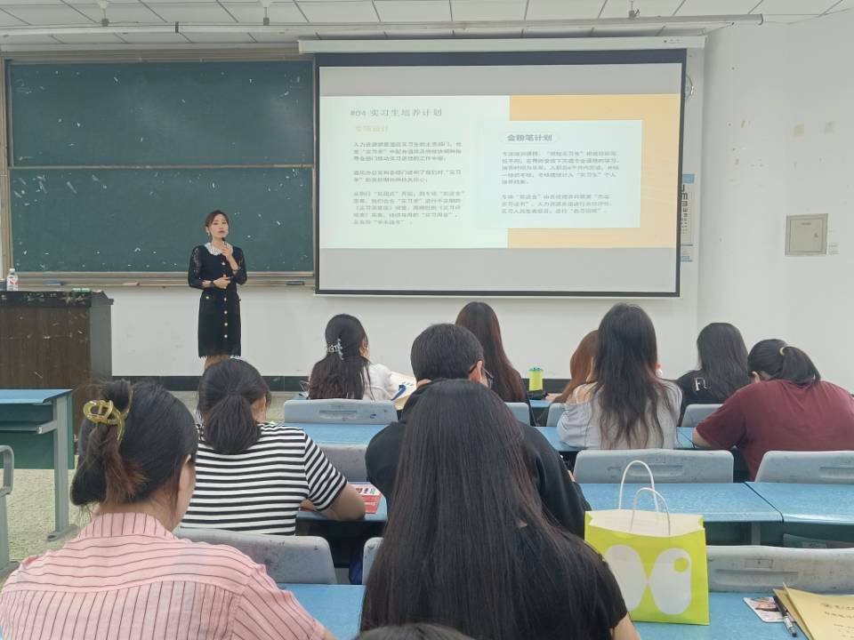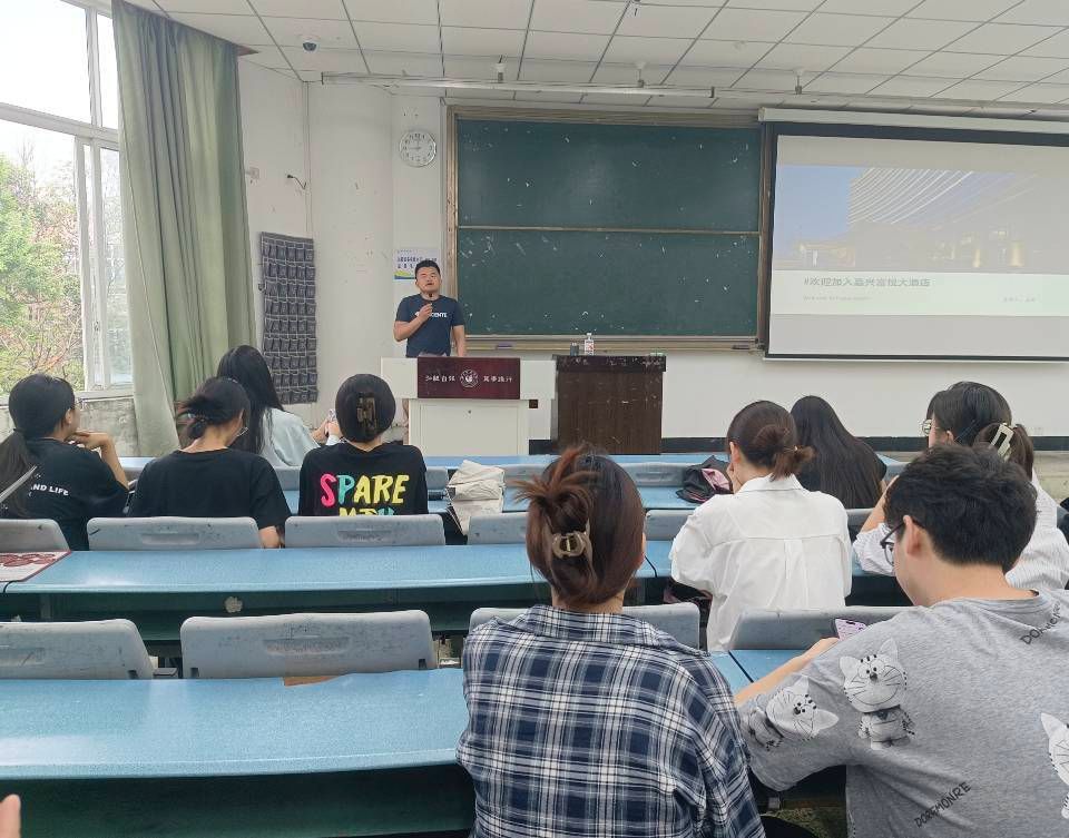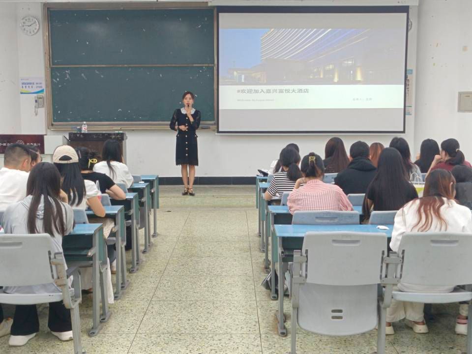 王莉首先分享了她的就业经历以及工作日常,帮助同学们对酒店业务有了初步的了解。随后,她从集团简历、企业认知、实习岗位、管理体系和福利待遇五个方面详细介绍了嘉兴富悦大酒店的相关情况。王莉女士详细介绍了酒店的地理位置、发展历程、实习生培养计划以及相关福利待遇等,为同学们提供了更多的实习工作机会,并对同学们的就业提供了指导。