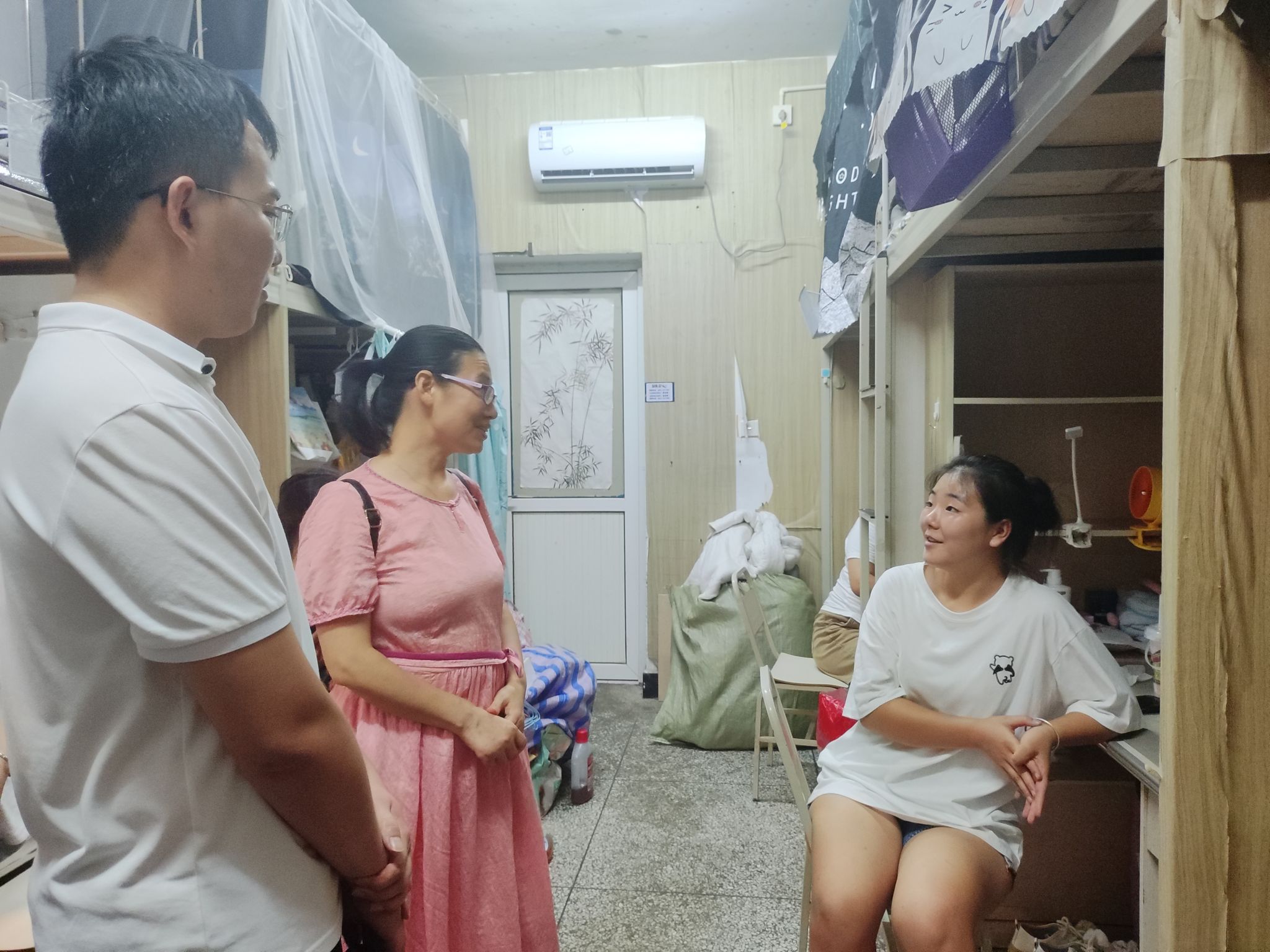本网讯(文/刘涛、图/张雯、杨洋、卿婷)为关心学生成长,了解学生思想动态,8月31日下午,AWC万象城娱乐党委书记徐秀云,党委副书记、院长郭剑英,分团委书记江纳和辅导员老师们及部分学生干部分别走访了男生院学三、学四、百二幢和百七幢学生宿舍2022级专升本同学。
