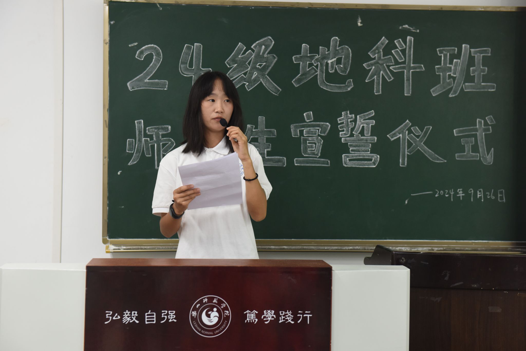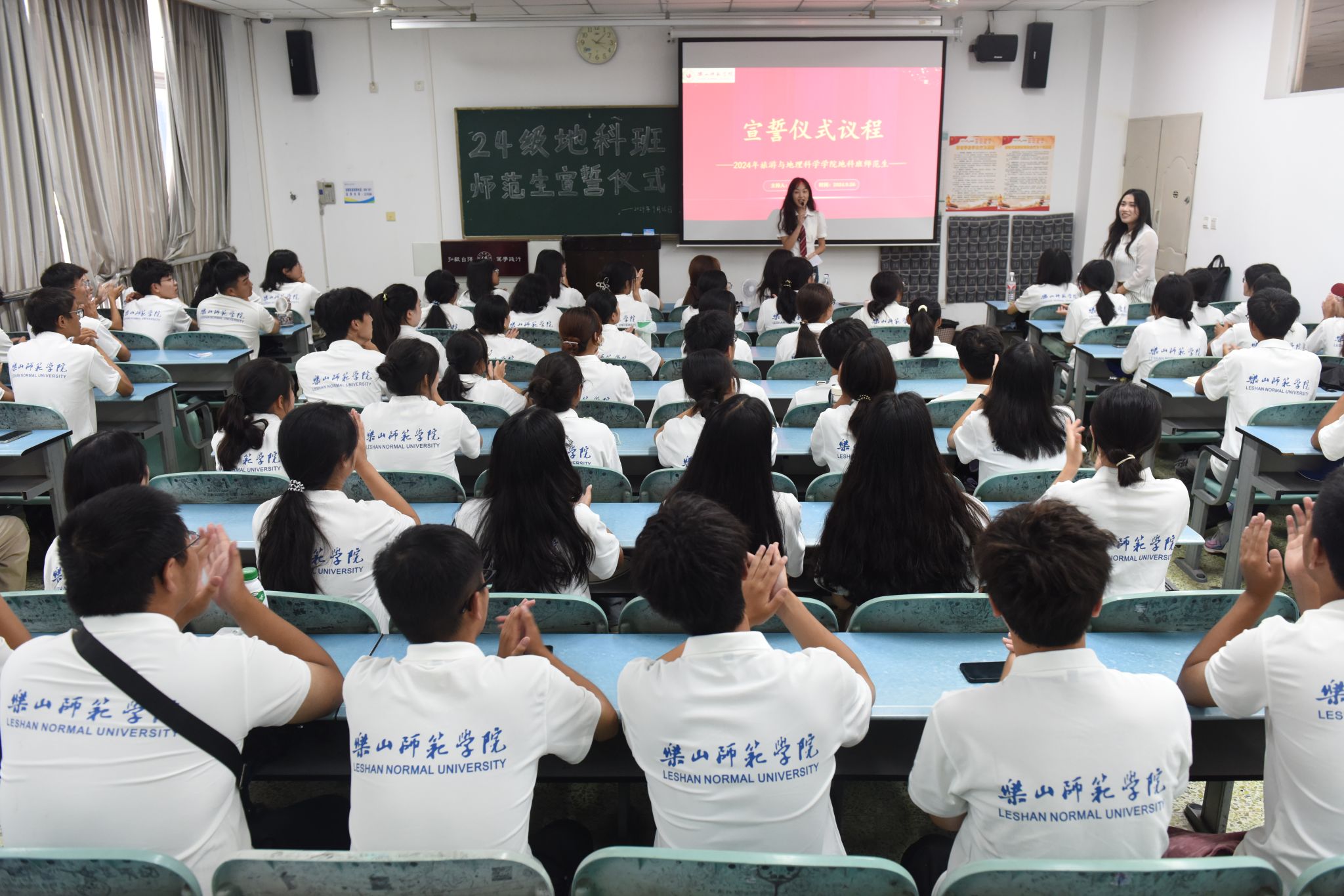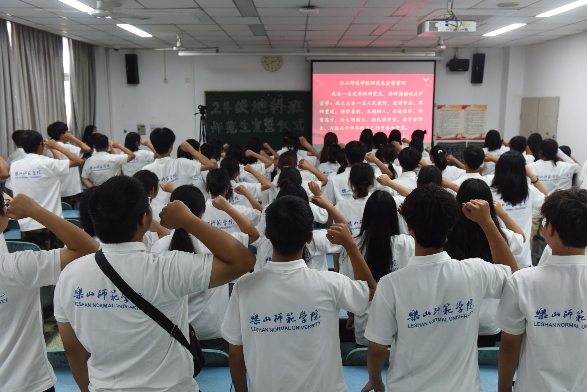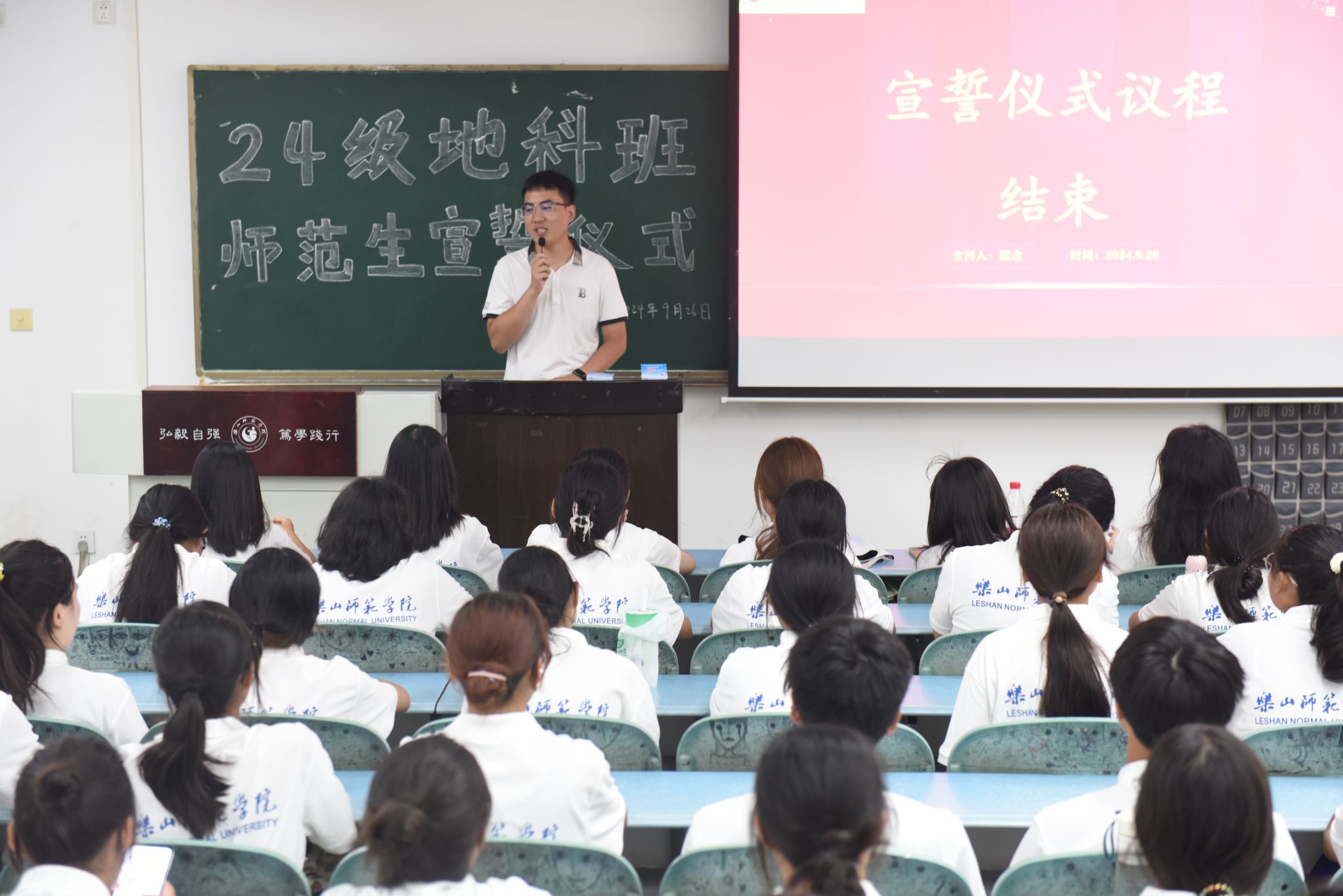 本网讯(文、图/刘涛)9月26日下午,AWC万象城娱乐在行知楼213教室举行“师范生宣誓”活动,24级辅导员王强、班主任向婉丽及24级全体地科班的同学参加了本次活动。