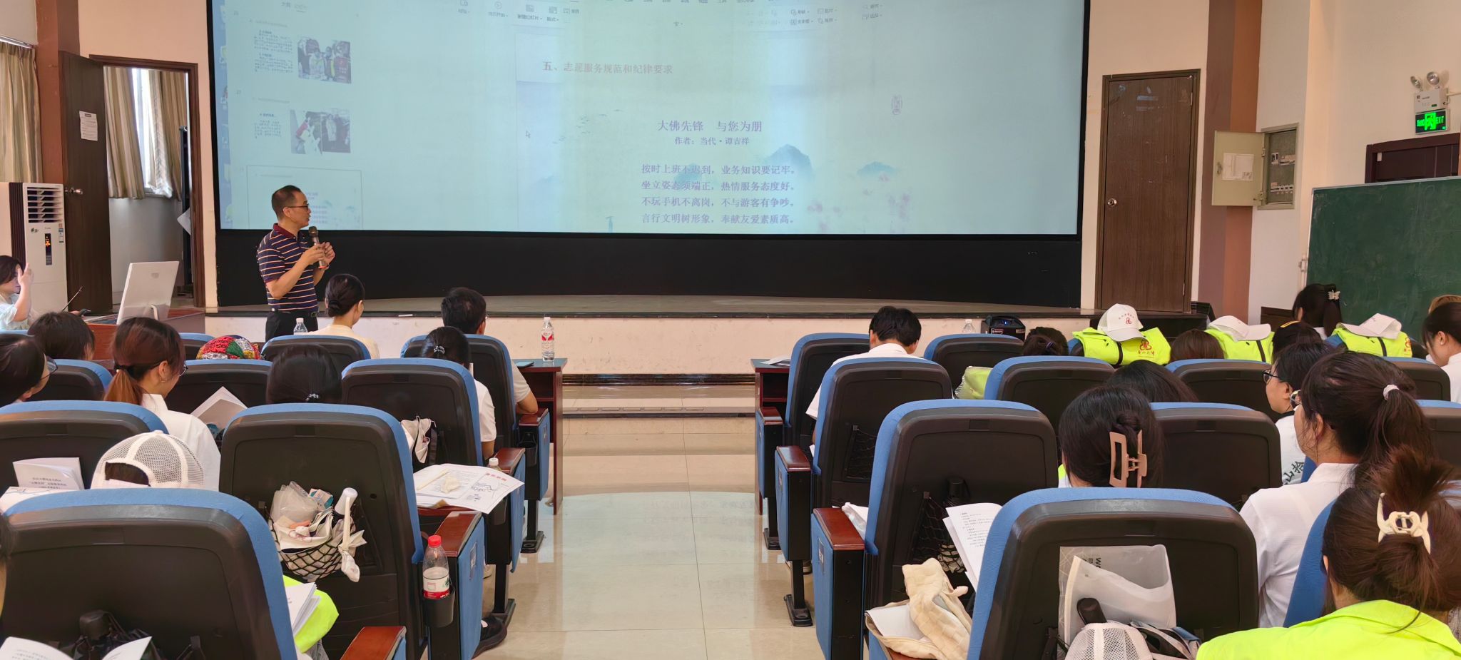 谭吉祥从中国志愿服务标识讲起,结合《志愿服务条例》《四川省文化旅游志愿服务工作指南》《乐山大佛世界文化和自然遗产保护条例》等讲了志愿服务的背景和意义,从“常态设点+旺季统筹”“标准项目+特殊帮扶”“优质服务+文明创建”“免费项目+增值服务”等方面讲解了“大佛先锋”志愿服务实践、服务特色和取得的荣誉与成效。他介绍了“大佛先锋”节假日志愿服务的内容和服务保障,强调了志愿服务规范和纪律要求,希望同学们充分发挥学科专业优势,服务旅游强国战略,以饱满的热情、积极的态度投身志愿服务,用爱心放飞梦想。