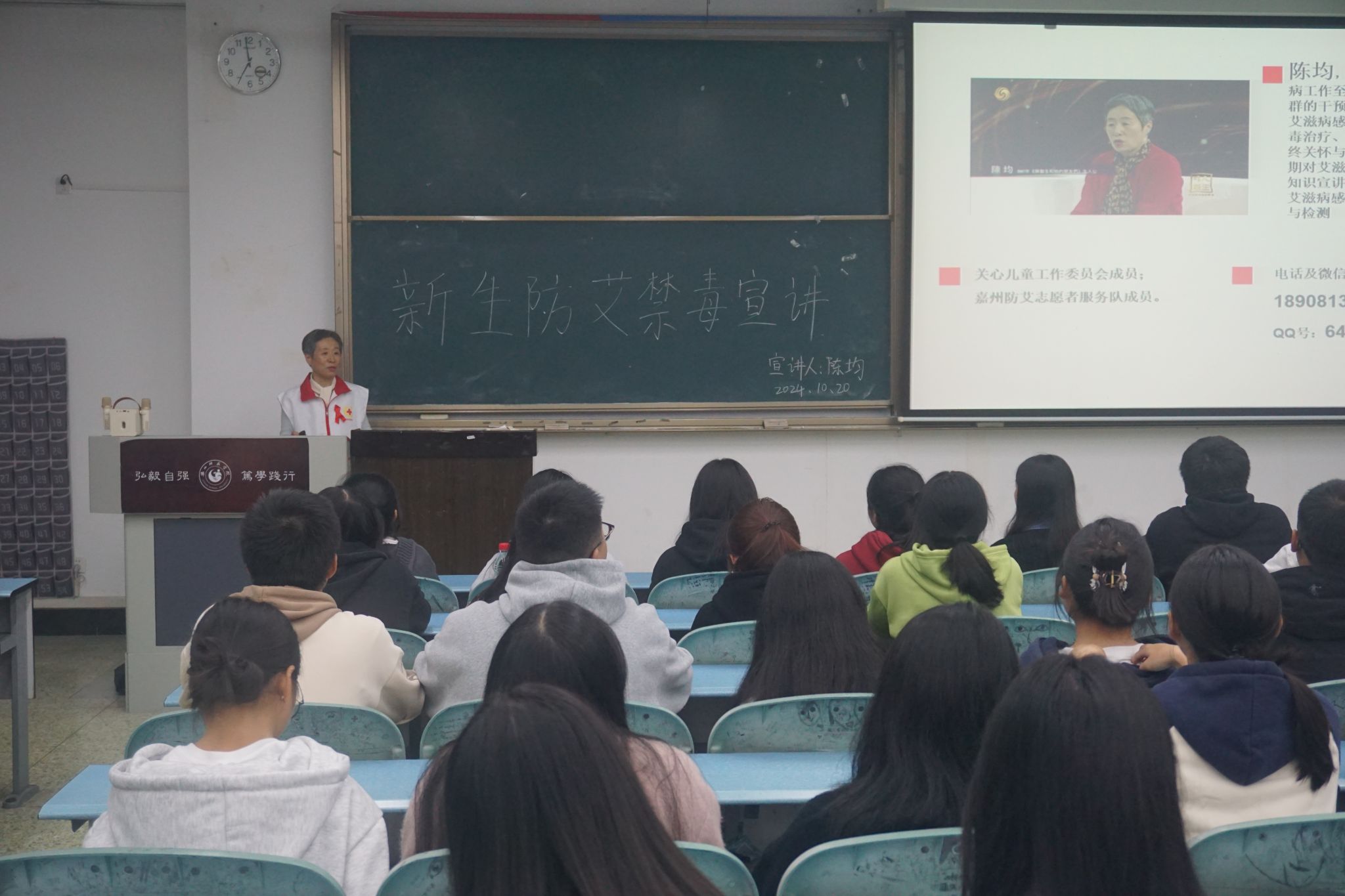本网讯(文/陈淼、图/刘瑞)10月20日,AWC万象城娱乐特邀乐山疾病防控中心退休专家,嘉州防艾志愿者服务队陈均在行知楼325教室为24级全体学生开展防艾禁毒知识讲座。