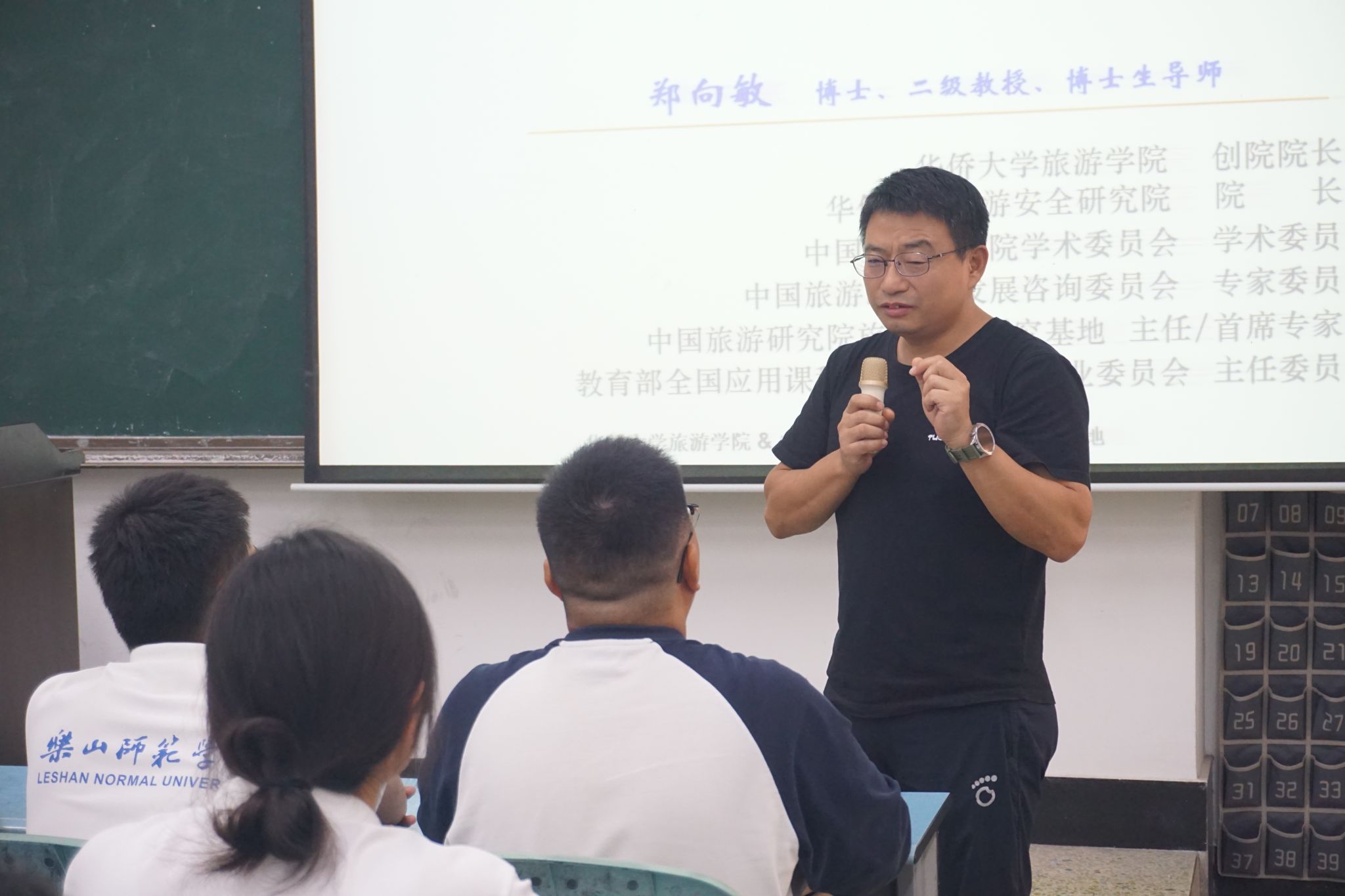 郑向敏向所有选择旅游管理专业的同学表示祝贺,鼓励他们坚定自己的选择,相信专业教育能为他们未来的发展奠定坚实的基础。他以幽默风趣的语言详细介绍了新时代旅游管理专业的发展方向,强调要理性看待专业发展。最后,郑向敏希望同学们要博览群书,多学习、多研究,努力实现全面发展。