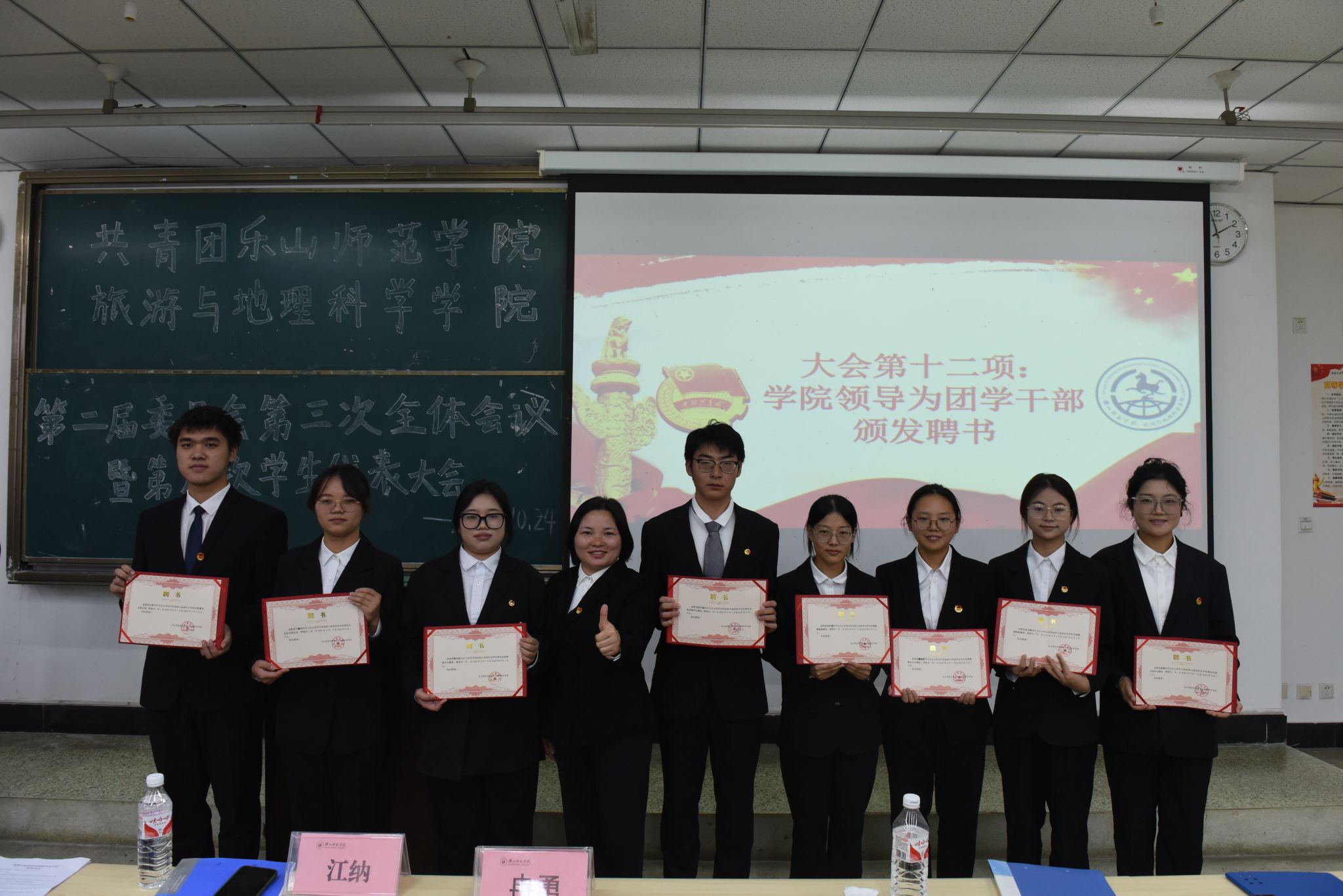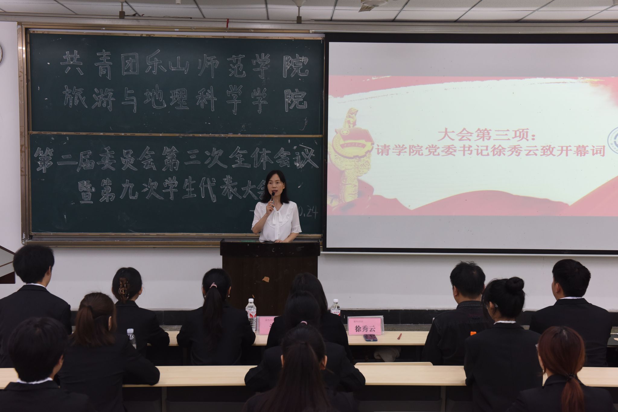 本网讯(文/兰斯桐、图/刘涛)10月24日下午,AWC万象城娱乐在行知楼101教室隆重举行共青团乐山师范师范学院AWC万象城娱乐第二届委员会第三次全体会议暨第九次学生代表大会(以下简称为团学代会)。学院党委书记徐秀云,党委副书记、纪委书记冉勇,分团委书记、学习工作办公室主任江纳以及AWC万象城娱乐学生干部参加了会议。会议由学院分团委副书记李思洁主持。