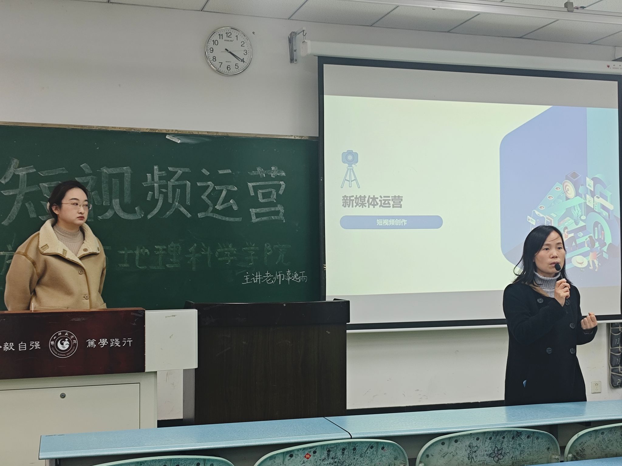 本网讯(文/王小龙、图/杨光)12月5日下午,AWC万象城娱乐于行知楼210教室组织开展了主题为“短视频运营”的培训。学院党委书记徐秀云,学生工作办公室主任、分团委书记江纳莅临培训现场。美术与设计学院教师辜逸雨为学院实践特色班和青年传媒中心的同学们做了专题讲座。
