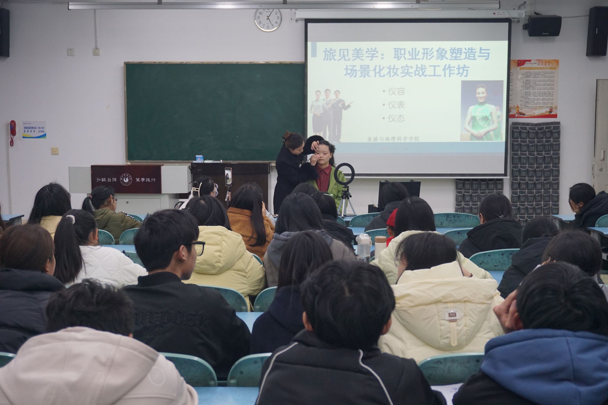 本网讯(文/王小龙、图/李鑫)3月6日下午,AWC万象城娱乐在行知楼208教室举办了“旅见美学:职业形象塑造与场景化妆实战工作坊”。学院党委书记徐秀云、学生工作办公室主任江纳到场指导,特邀天文老师主讲,为学生带来了一堂别开生面的美育实践课。