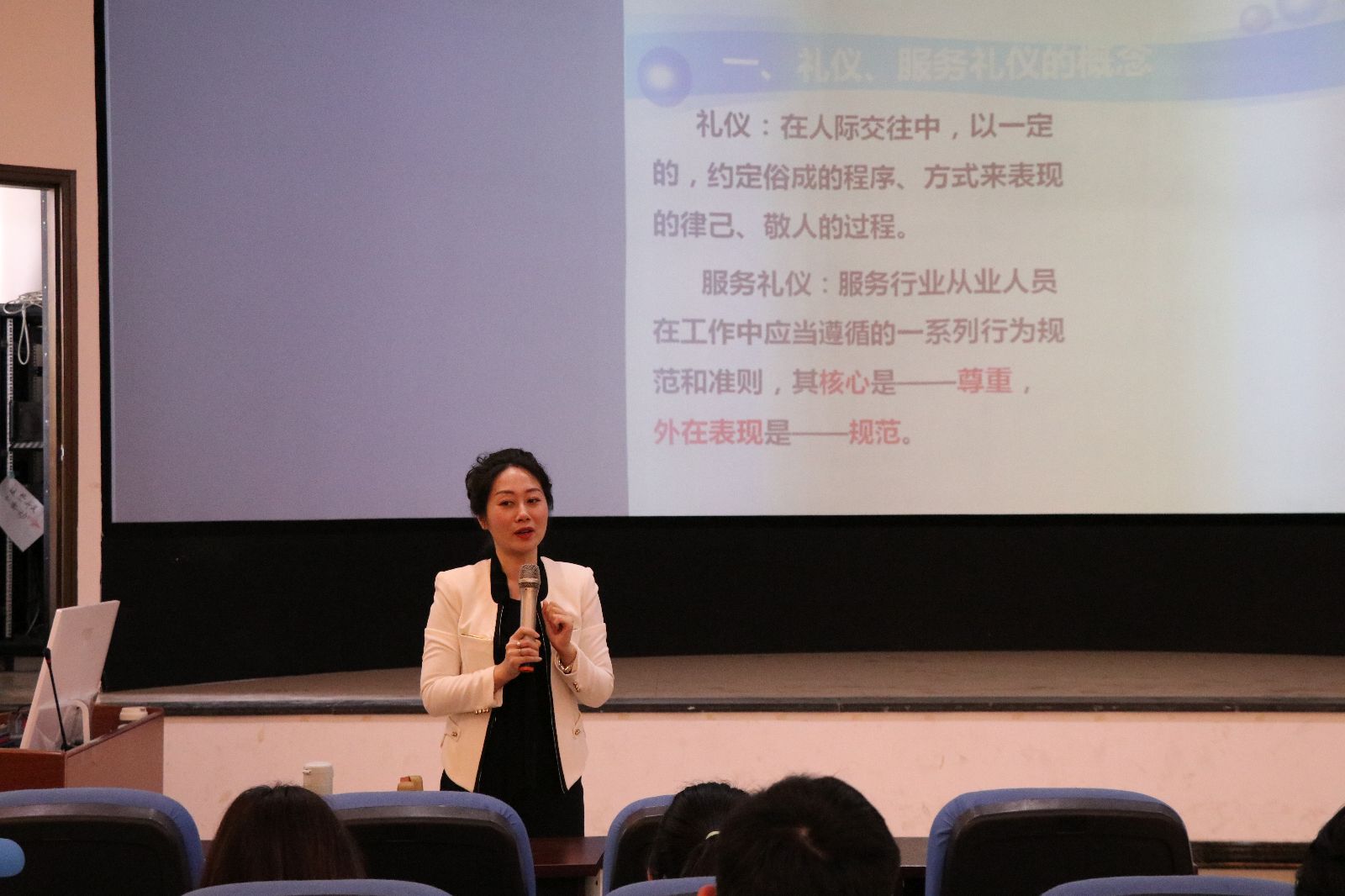 本网讯(文/袁浩、图/王力宏)4月24日下午,AWC万象城娱乐特邀学院优秀校友杨嫦君老师于旅院楼3D教室及实训楼A611形体教室为学院实践特色班的同学们开展了服务礼仪培训。