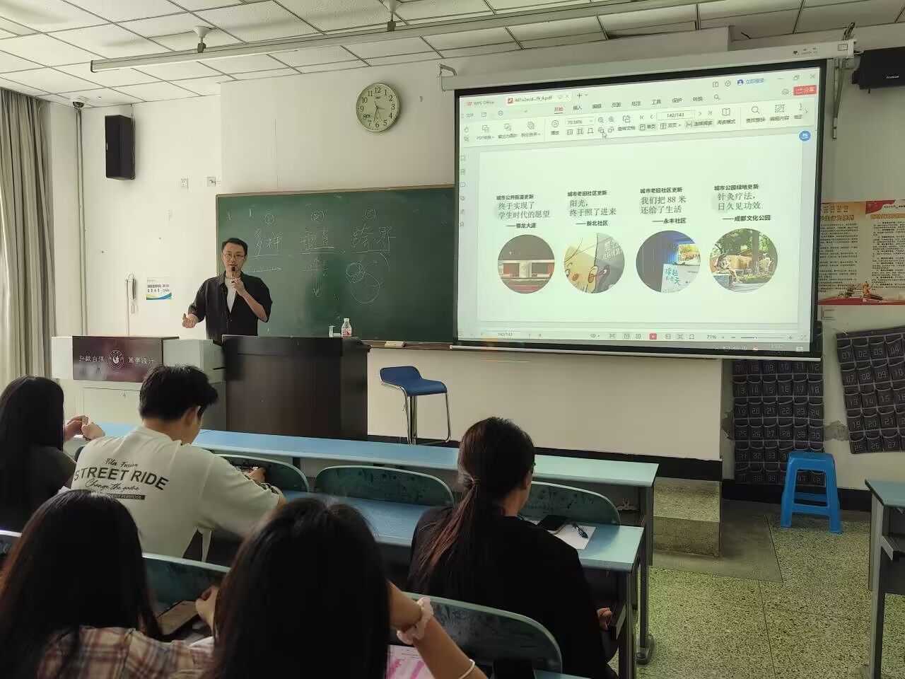 蒋侃迅以“设计赋能城乡发展”为主线,深入探讨了“生态景观的可持续性设计”“旅游地理的空间重构策略”以及“乡村振兴的景观介入路径”三大核心模块。他重点展示了团队最新完成的“川西林盘景观再生”项目,详细阐述了如何将生态理念转化为切实可行的设计方案。在讨论空间规划时,他创新性地提出了“旅游流量-景观承载力”动态平衡模型。针对人文地理专业的特点,蒋侃迅提出了“三维能力”培养建议:不仅要掌握GIS等空间分析技术,还要注重美学素养与设计思维的培养,更要深入理解城乡发展的社会逻辑。在互动环节,他结合成都公园城市建设的实际案例,解答了同学们关于“专业学习与行业需求衔接”方面的诸多困惑。
