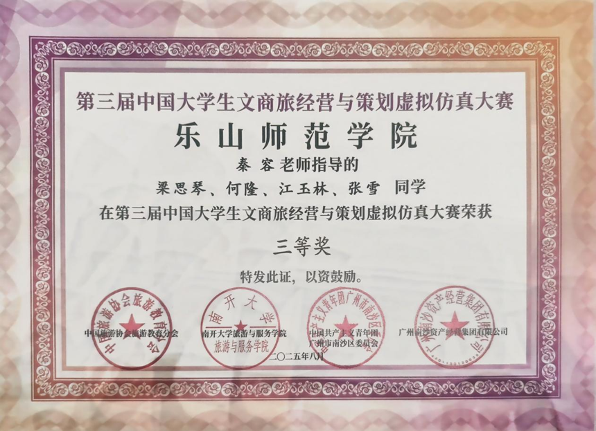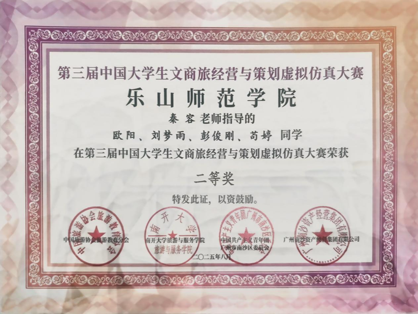 本网讯(文、图/秦容)8月19日至24日,由中国旅游协会旅游教育分会、南开大学旅游与服务学院、中国共产主义青年团广州市南沙区委员会、广州南沙旅游发展有限公司联合主办的第三届中国大学生文商旅经营与策划虚拟仿真大赛决赛在广州市南沙区圆满落幕。万象城酒店管理专业的欧阳、旅游管理专业的苟婷、刘梦雨、彭俊刚同学组成的“先锋少年队”荣获二等奖;酒店管理专业的梁思琴、何隆、江玉林、张雪同学获得三等奖。