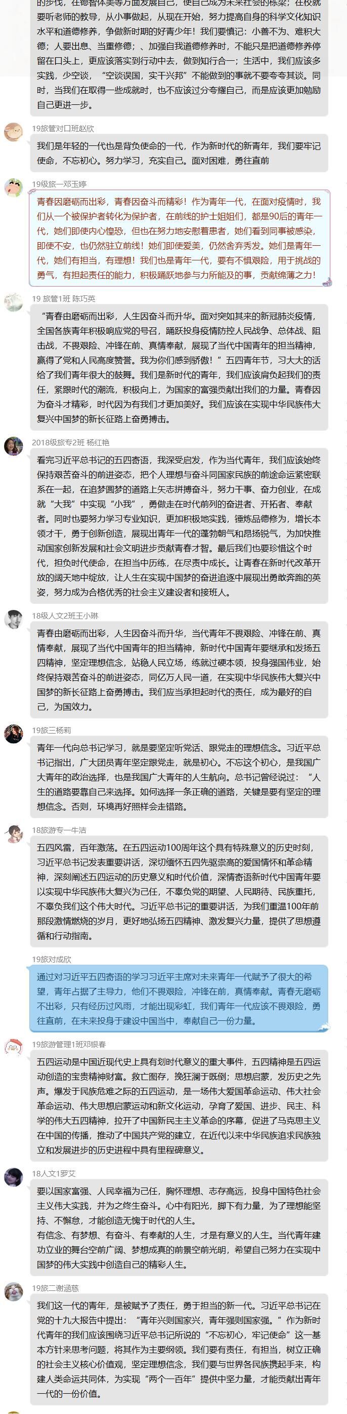 为深入学习贯彻习近平总书记五四寄语精神,旅游学院分团委先后于7日和11号在线举行了五四精神暨学习习近平总书记五四寄语的心得交流会,活动以总书记五四寄语精神为“主心骨”,学习贯彻寄语精神的总体思路。同学们通过线上结合总书记的寄语进行探讨式发言,各抒己见,并结合自己的经历对“五四精神”发表了看法,通过学习、服务社会亦或是详细的人生规划,这些都无一不体现着现当代青年的想法。