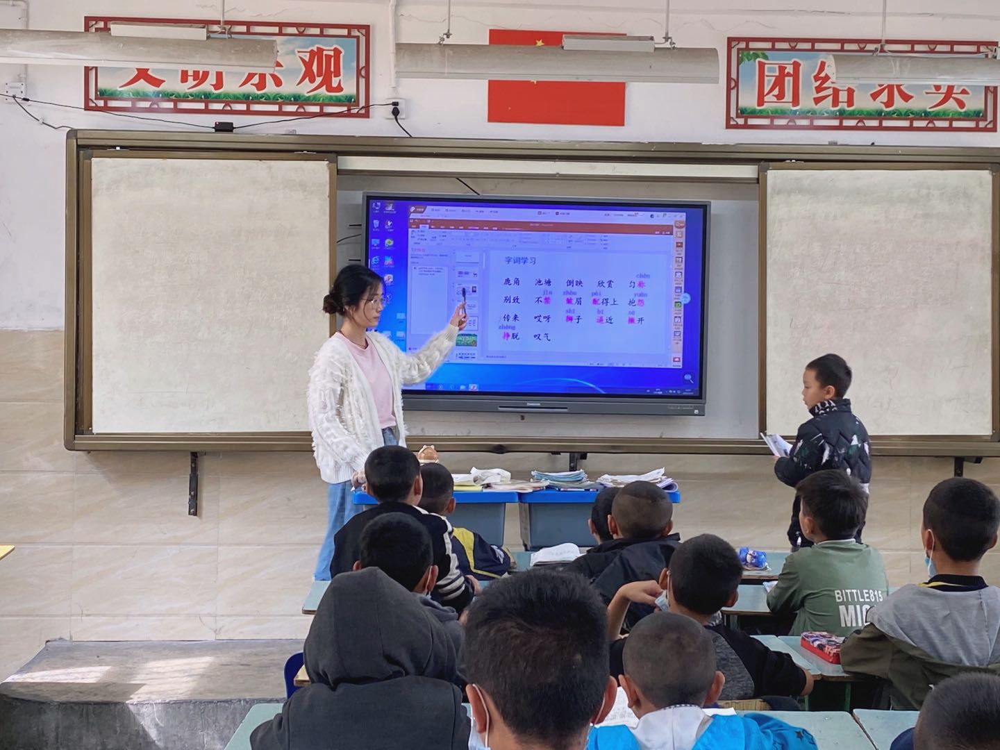 陈凌昌倩主要上的是小学3年级的语文课,另外还上英语、音乐、科学等科目。她得迅速适应自己的工作和学生。孩子们有些甚至不太会说普通话,平时使用民族语言比较多。第一堂课,由于没什么经验,仅是教孩子们认词语、写生字都让她感觉比较吃紧。不仅如此,陈凌昌倩给孩子们上课时,有些孩子喜欢突然站起来或是大声说话,课堂组织对她来说也是一大挑战。