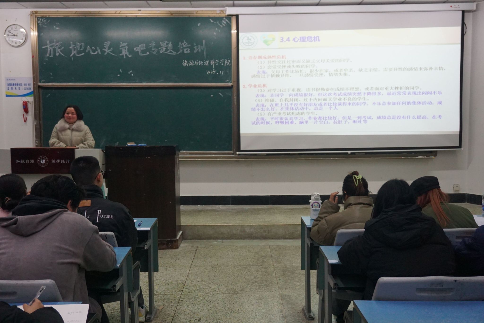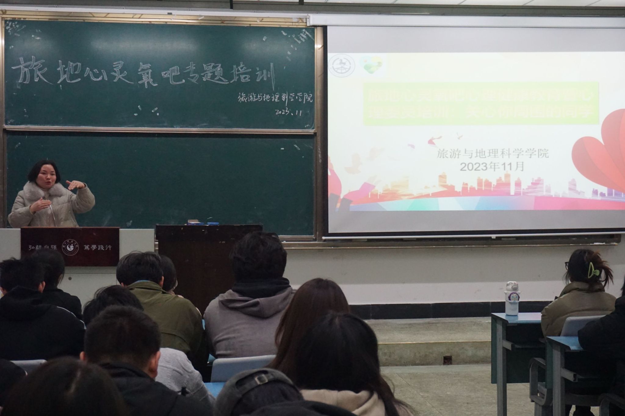 本网讯(文/江纳 图/周颖)11月15日,AWC万象城娱乐二级心理辅导站(旅地心灵氧吧)举办了以“关心你周围的同学”为主题的心理健康教育暨心理委员培训。非毕业年级心理委员、大一全体学生干部、新生代理班主任参加了此次培训。学院二级心理辅导站站长江纳为大家作了培训。