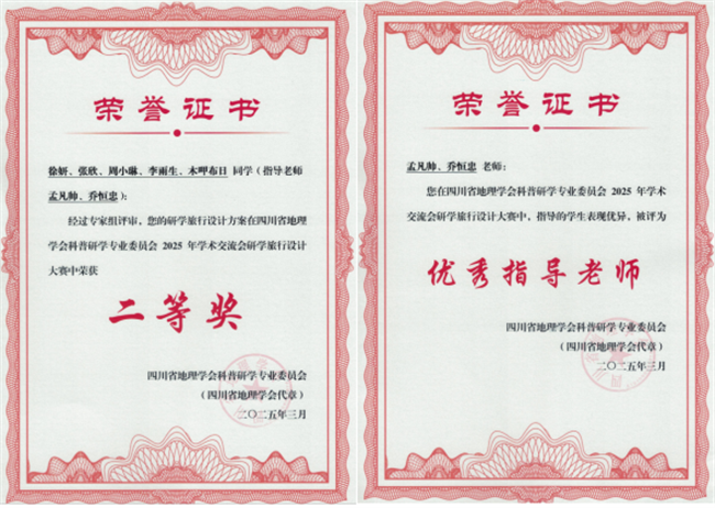本网讯(文/徐妍,图/魏薇)3月29日,由四川省地理学会科普研学专业委员会主办的研学旅行设计大赛在绵阳师范学院圆满落幕。由万象城AWC万象城娱乐徐妍、张欣、周小琳、李雨生、木呷布日5名同学组成的团队在比赛中表现出色,斩获二等奖,指导教师孟凡帅、乔恒忠荣获“优秀指导老师”奖。