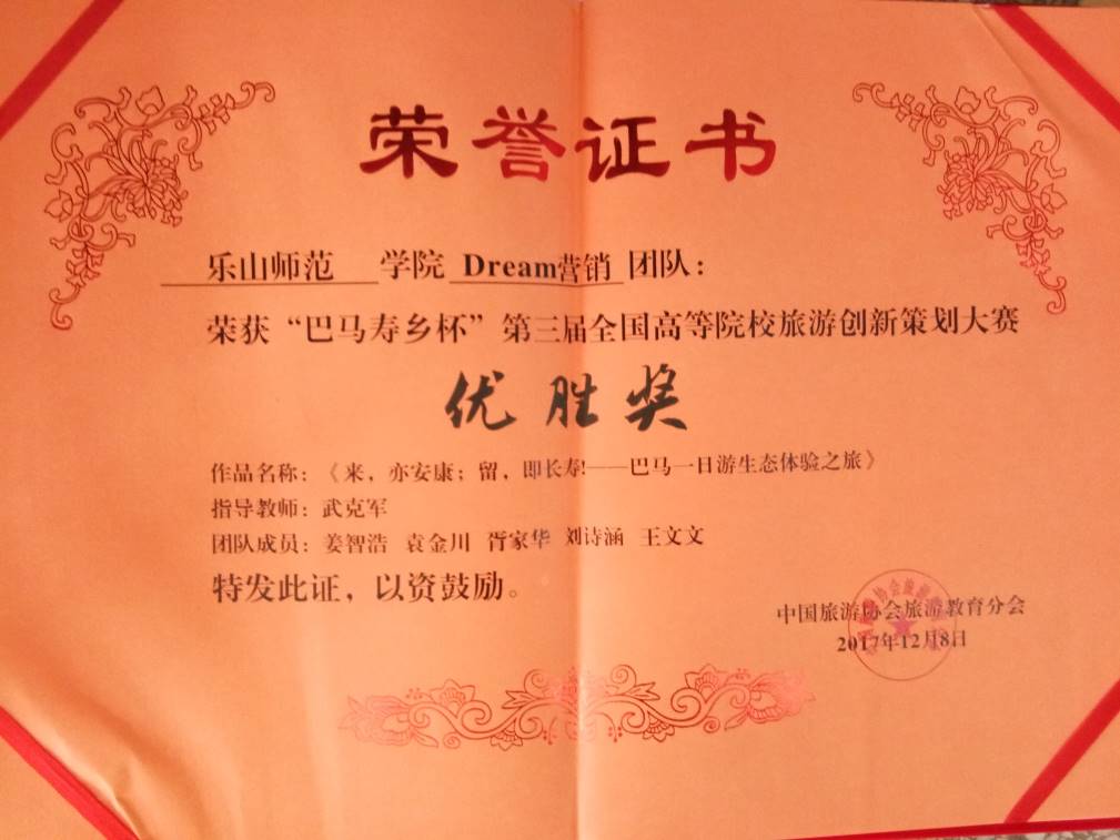 万象城旅游学院武克军博士带队(学生姜智浩、袁金川、胥家华、刘诗涵、王文文)通过激烈的初赛,最终进入决赛,作品主题为“来亦安康,留即长寿”-巴马一日游生态体验之旅。经过老师和同学们6个月的努力,作品入围20强,在最终决赛中取得第14名,获得优胜奖的好成绩!