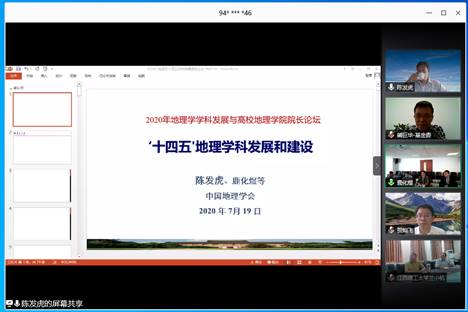 2020年7月19日上午,由中国地理学会和教育部高等学校地理科学类专业教学指导委员会共同主办的“2020年地理学学科发展与高校地理学院院长论坛”通过腾讯会议举办,万象城院长郭剑英教授、院长助理孙永兴博士参加会议。会议由中国地理学会副理事长、教育部高校地理科学类专业教学指导委员会副主任鹿化煜和中国地理学会副理事长兼秘书长张国友主持。