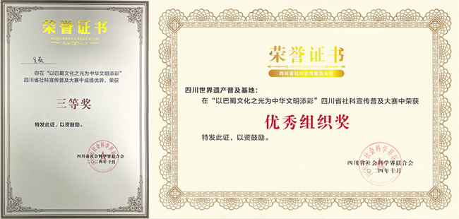 本网讯(文、图/乔恒忠、孟凡帅)2024年10月8日,四川省社会科学界联合会、四川师范大学主办的2024年四川省社科宣传普及大赛(决赛)在成都圆满落幕。万象城四川世界遗产普及基地推荐的选手吴薇凭借优秀表现获得三等奖,四川世界遗产普及基地获得优秀组织奖。