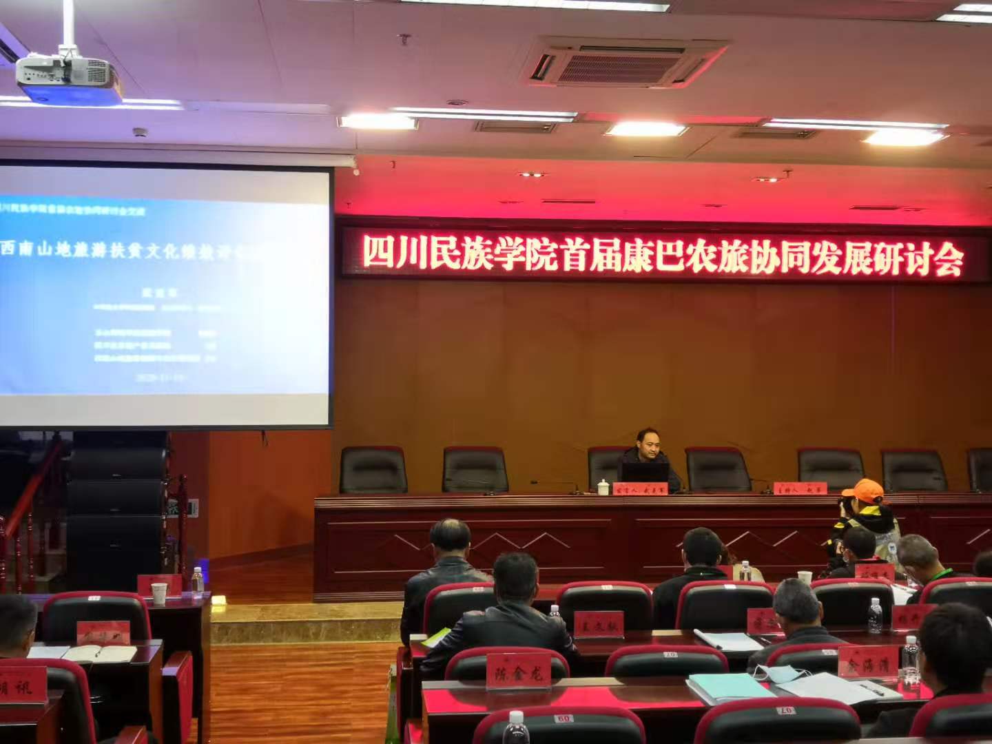在四川民族学院B校区综合楼,武克军博士和陈金龙副教授参与旅游分组研讨会,就甘孜州十四五旅游发展的机遇与挑战进行了热烈讨论。与会代表一致认为,共同构建良好的乡村振兴协同创新中心,组建甘孜州农旅发展专家智库,可为甘孜州的未来发展献智献策。