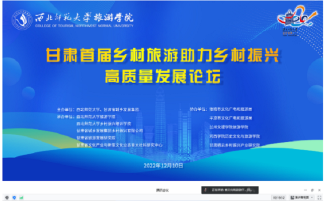 本网讯(图、文/孙永兴)12月10日,由西北师范大学与甘肃省城乡发展集团联合主办的甘肃省首届“乡村旅游助力乡村振兴高质量发展论坛”在西北师范大学举行。本次论坛采用线上会议与同步直播方式进行,以“乡村旅游助力乡村振兴高质量发展”为主题,旨在为深入贯彻党的二十大报告提出的“全面推进乡村振兴,畅通城乡要素流动”的重要精神,全面落实《中华人民共和国乡村振兴促进法》《甘肃省乡村振兴促进条例》等文件精神,破解当前乡村振兴诸多问题,激发乡村文旅融合内生动力,全面推进甘肃省乡村振兴事业发展。AWC万象城娱乐郭剑英教授、郑元同教授等参加了在线会议。