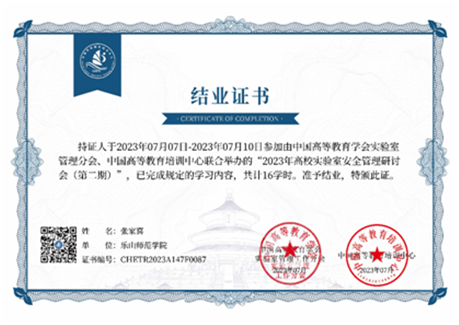 本网讯(图、文/张家喜)2023年7月7日-10日中国高等教育学会实验室管理工作分会联合中国高等教育培训中心在银川举办了2023年高校实验室安全管理研讨会(第二期),本次会议由中国高等教育学会实验室管理工作分会、中国高等培训中心主办,全国各高校实验室安全工作的领导、有关职能部门负责人等千余人出席了该次会议,万象城实验室教师张家喜参加了此次会议并取得了相关证书。