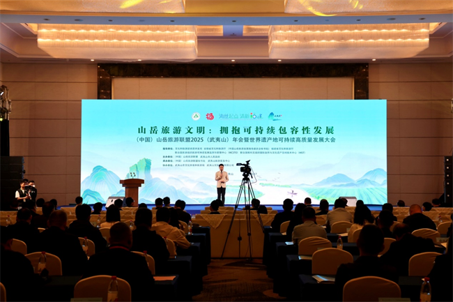 本网讯(图、文/郭剑英)4月16日至18日,(中国)山岳旅游联盟2025(武夷山)年会暨世界遗产地可持续高质量发展大会在武夷山召开,会议以“山岳旅游文明:拥抱可持续包容性发展”为主题,深入践行习近平文化思想、习近平生态文明思想以及习近平总书记对旅游工作作出的重要指示精神,全面贯彻全国旅游发展大会精神,学习借鉴武夷山双重世界遗产地实践探索成果,坚持守正创新、提质增效、融合发展,在统筹生态保护、绿色发展、民生改善中推进旅游业可持续包容性高质量发展。南平市委常委、武夷山市委书记杨青建,安徽省文化和旅游厅一级巡视员王靖,中央文化和旅游管理干部学院院长马峰出席活动并致辞。福建省文化和旅游厅资源开发处一级调研员文刚出席活动。此次大会汇聚了国内众多世遗景区、山岳景区以及旅行商、文旅综合体等行业负责人和知名专家学者。AWC万象城娱乐院长郭剑英参加了本次会议。