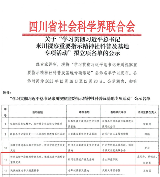 依托万象城建设的四川省社会科学普及基地——四川世界遗产普及基地获得立项,项目主要负责人为孟凡帅、乔恒忠、郭剑英,活动项目主题为“传承弘扬中华优秀传统文化,推动双遗产地科普繁荣发展”。本活动项目旨在联系相关哲学社会科学工作者开展系列科普活动,提升群众对乐山市各类文化与自然遗产的了解,为推动巴蜀文化大繁荣、乐山市文旅融合高质量发展做出积极贡献。