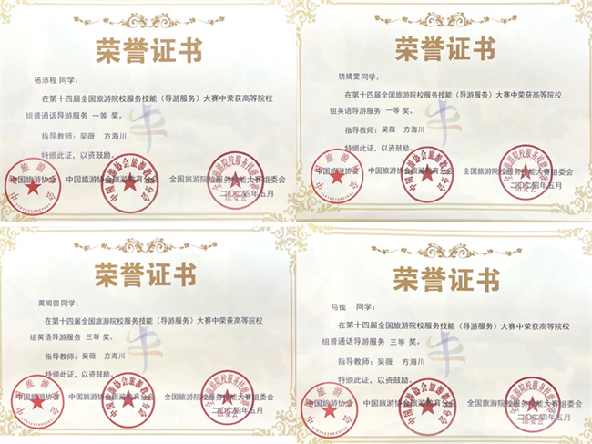 本次大赛分普通话导游服务、英文导游服务两个组别。比赛内容包括自选导游讲解、专题讲解、才艺展示和理论知识考试四个项目。在学校和学院的高度重视下,在指导老师的悉心指导下,参赛选手经过认真准备,以良好的专业水平和职业素养赢得大赛评委和各兄弟院校的高度评价。
